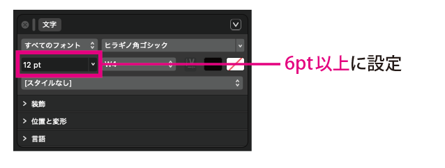 6pt未満の場合、文字がかすれたりつぶれたりする可能性があります。