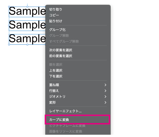 • 右クリック→「カーブに変換」をクリックしてください。テキストオブジェクトがカーブ(パス)に変換されます。