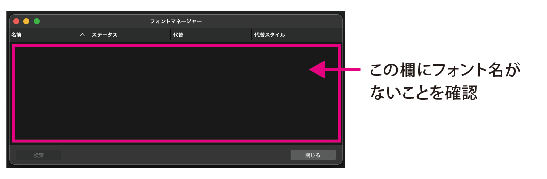 • メニューの「ドキュメント」→「フォントマネージャー」を選択し、フォント名が表示されていないことを確認します。