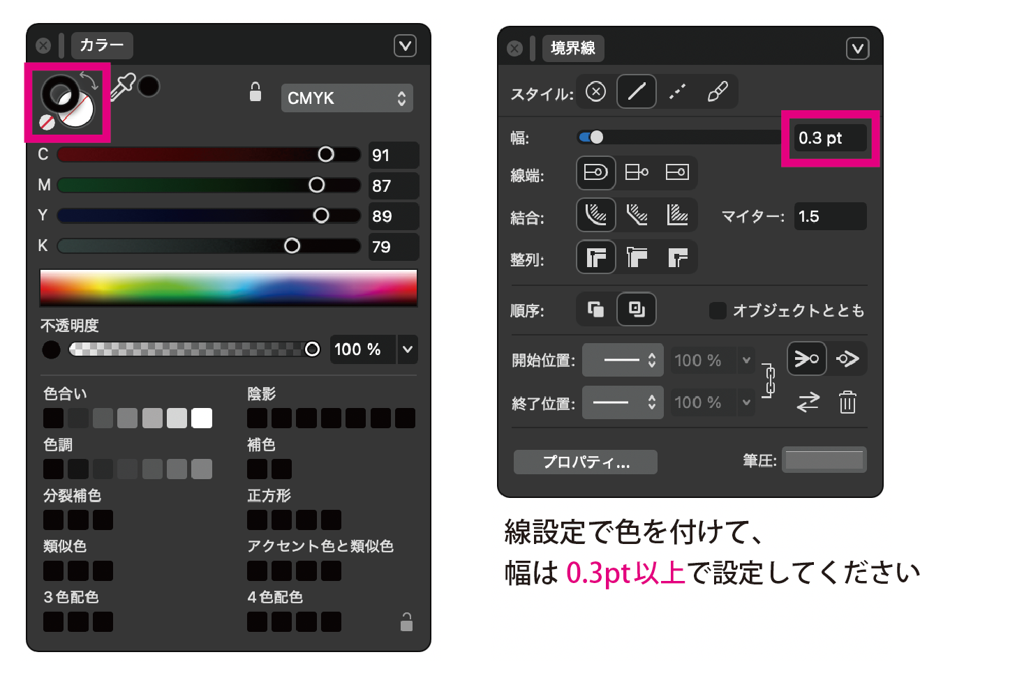 - 線幅を0.3pt以上で設定してください。線に色を付けるときには線設定を利用してください。