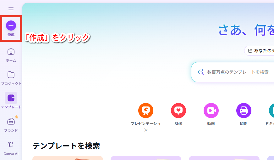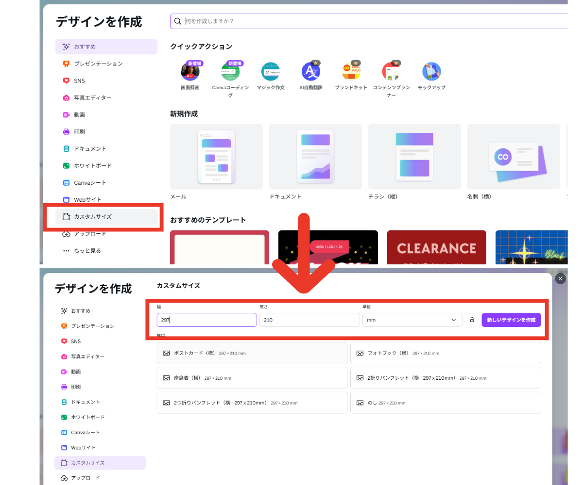 サイズ設定:CanvaこのページではCanvaのサイズ設定についてご案内いたします。 サイズ設定方法 1.「作成」をクリックする 2.「カスタムサイズ」を選択し、サイズを入力する サイズ入力後、「新しいデザインを作成」をクリックで編集画面に進みます。 例)チラシA4サイズの場合 縦297mm、横210mm 本ガイドで問題が解消されない場合は、Canvaサポートへのお問い合わせをご検討ください。 このページは役に立ちましたか? 役に立った 役に立たなかった