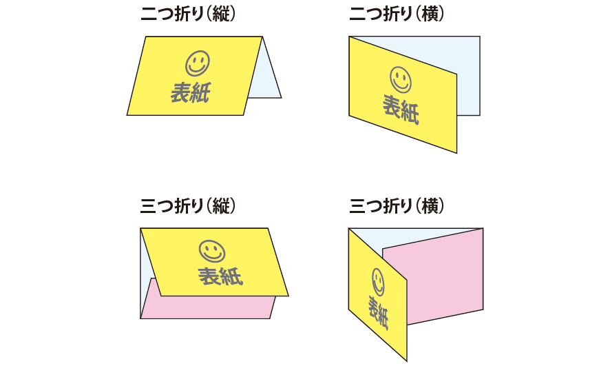 「二つ折り(縦)」「二つ折り(横)」のように、ご注文の仕様によって仕上がりが異なります。