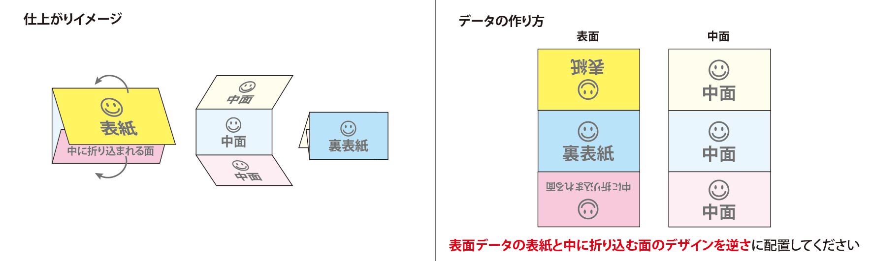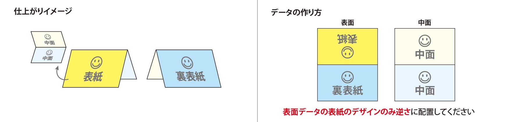 折りたたんだ際に、表紙や中に折り込まれる面の上下の向きが変わります。