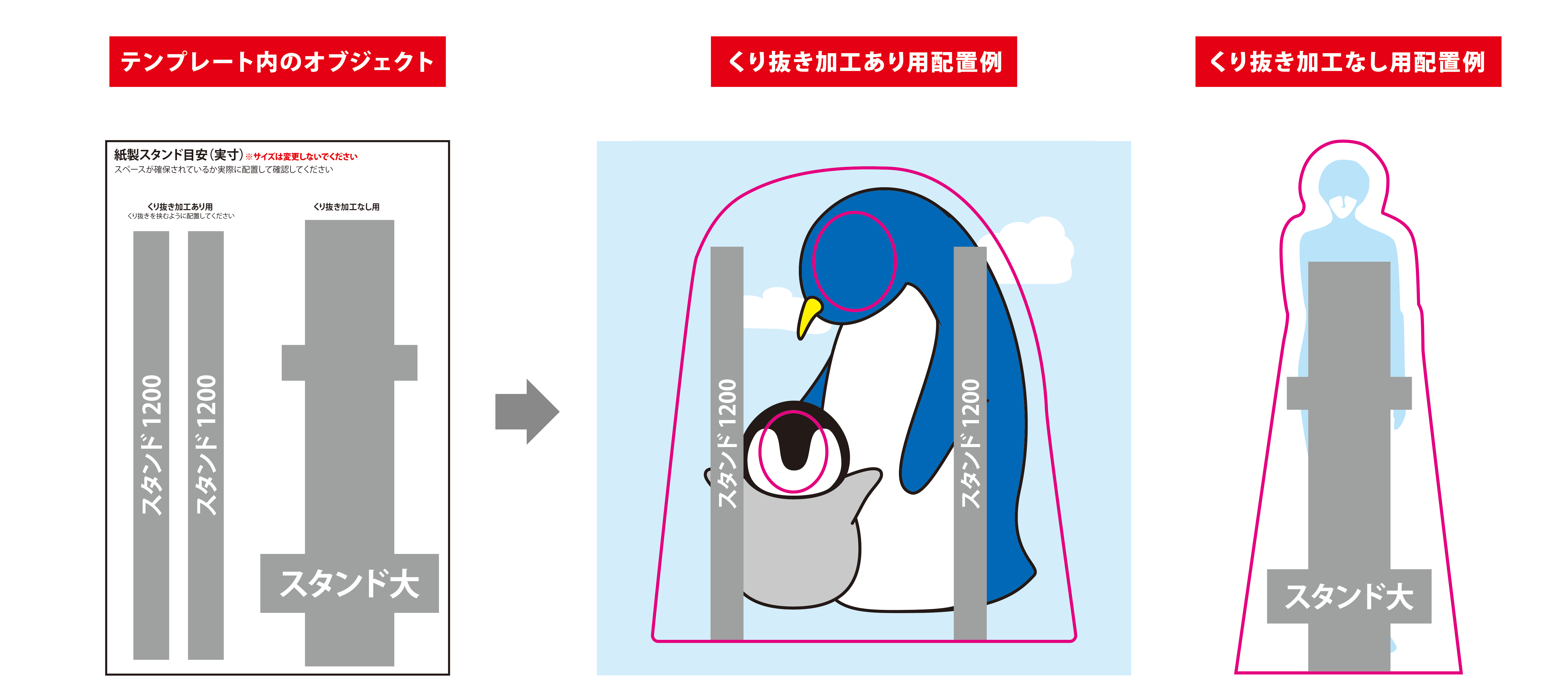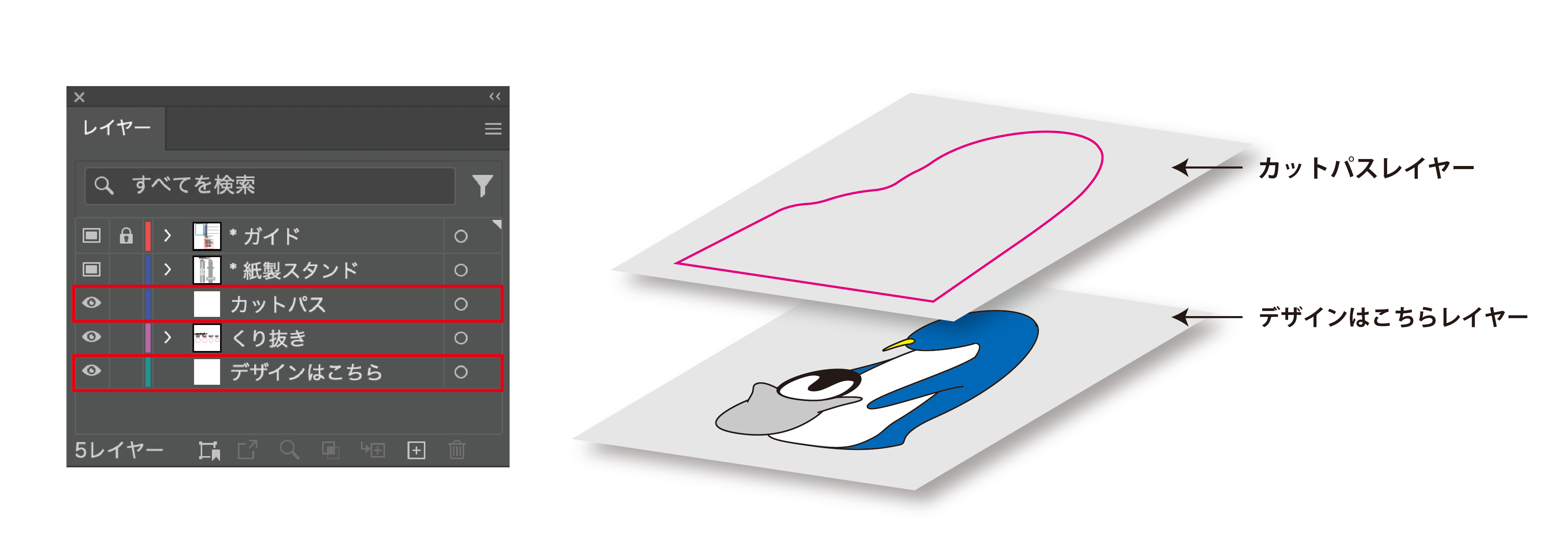 - 「デザイン」「カットパス」「くり抜き」「紙製スタンド」は必ずレイヤーを分けて配置してください。