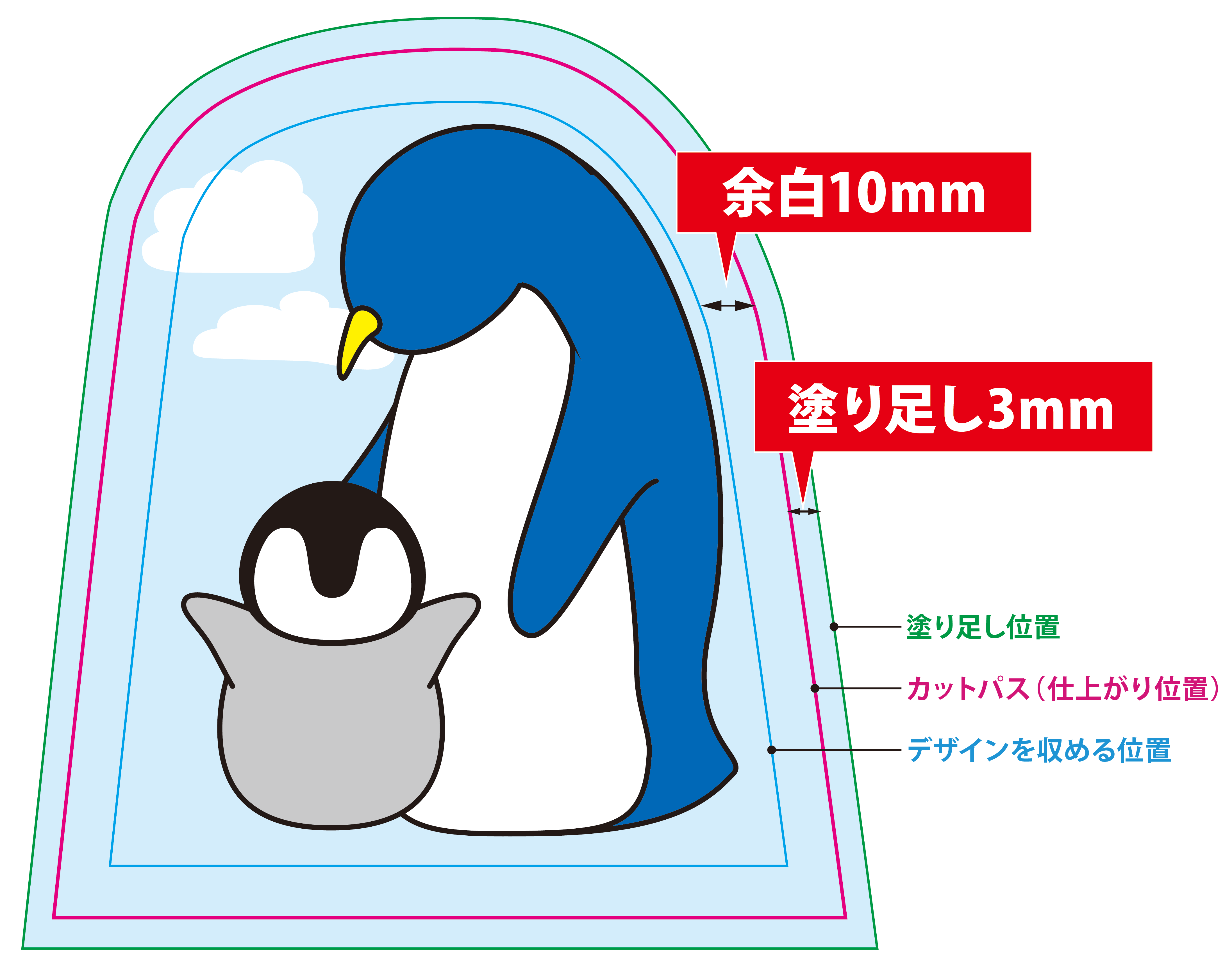 また切れては困る文字やデザインは、カットパスから10mm離して配置してください。