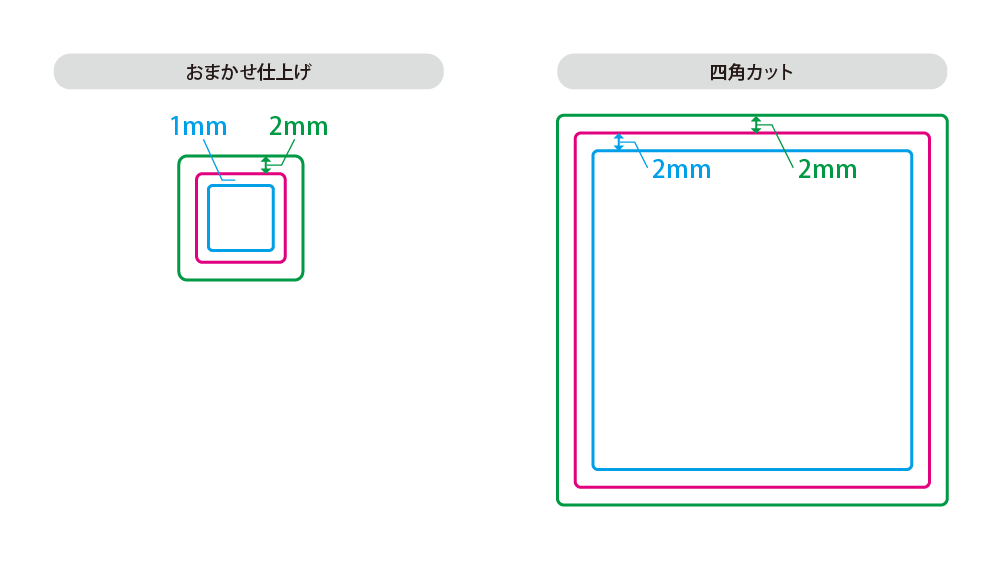 フチなし印刷をご希望の場合、いずれの納品形態でも2mm以上の塗り足しが必要です。