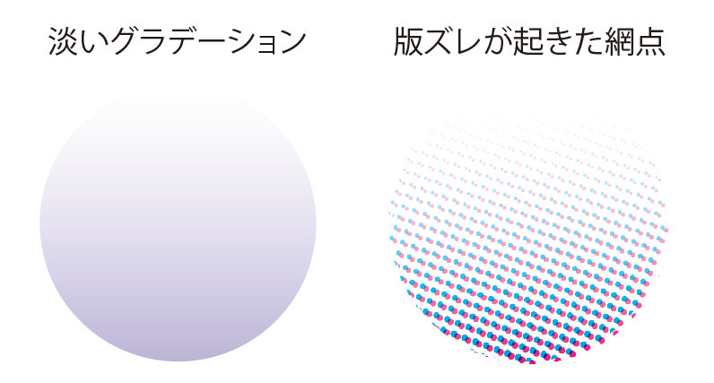 色が薄いほど点と点の間隔が広くなるため、版ズレ以外にもグラデーションや淡い色合いの場合、点の集合が目立ちやすくなります。