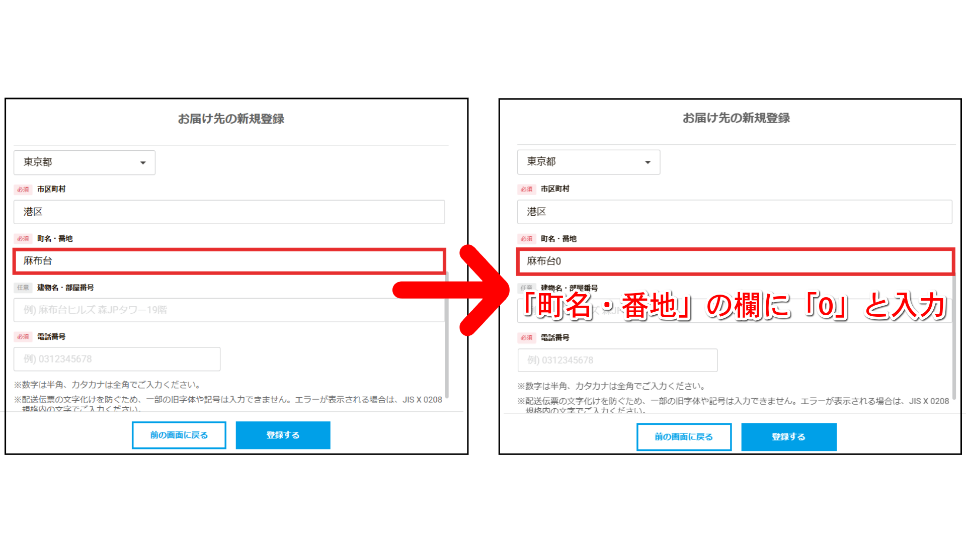 住所に番地がありません。どう登録すれば良いですか?サイトの仕様上、住所の番地欄には数字をご入力いただく必要がございます。 ご入力いただく住所に番地がない(無番地)場合は、「町名・番地」の欄に「0」とご入力いただき、登録へお進みください。 市区町村やそれ以降の住所が正しく入力されていれば、商品のお届けに影響はございませんのでご安心ください。 このページは役に立ちましたか? 役に立った 役に立たなかった