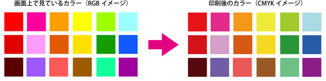 特に発色の強い鮮やかな色はくすんだような色味に変化する傾向がございます。あらかじめご了承の上、ご制作ください。CMYKとRGBカラーについて詳細はCMYKカラーとRGBカラーをご確認ください。