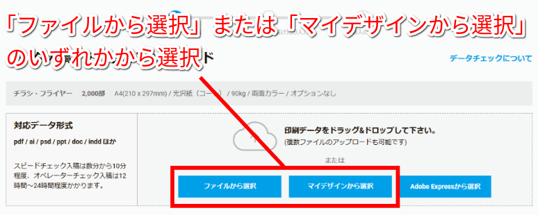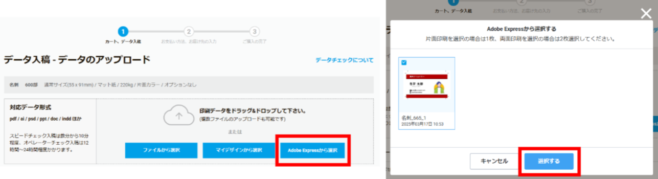 ご入稿の際は、Adobe Expressのデータを1つ選択し、もう1つは「ファイルから選択」または「マイデザインから選択」のいずれかからご選択ください。