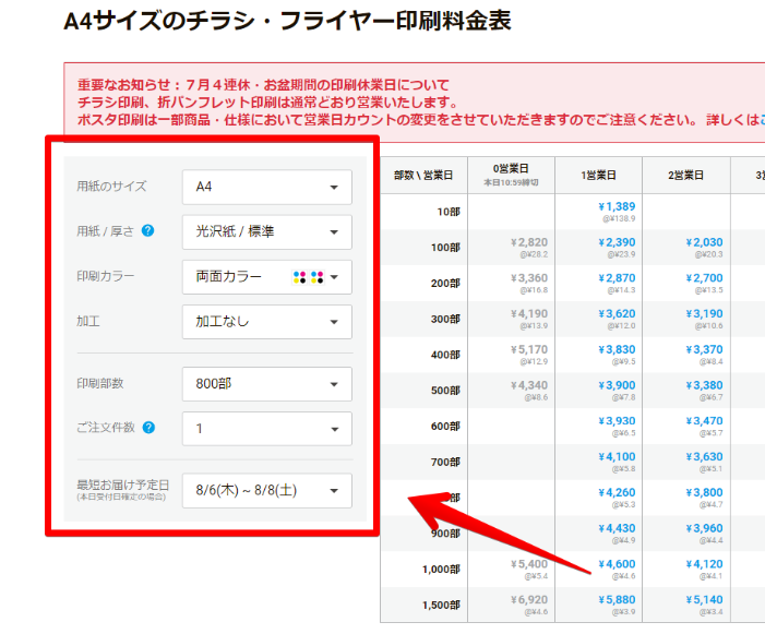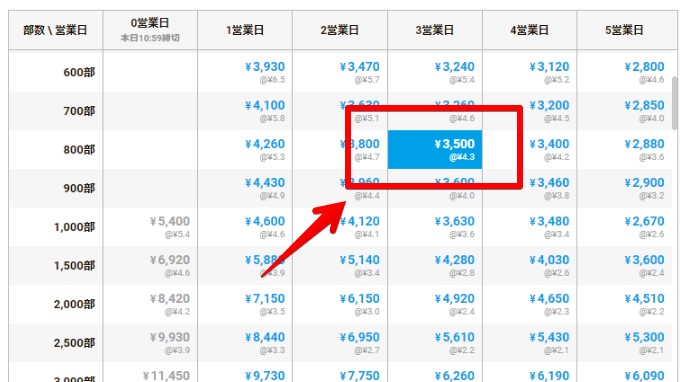 は、右側の表からもお選びいただけます。選択した部数・出荷日は青く表示されます。「○営業日後」は「受付日確定から出荷まで」の日数です