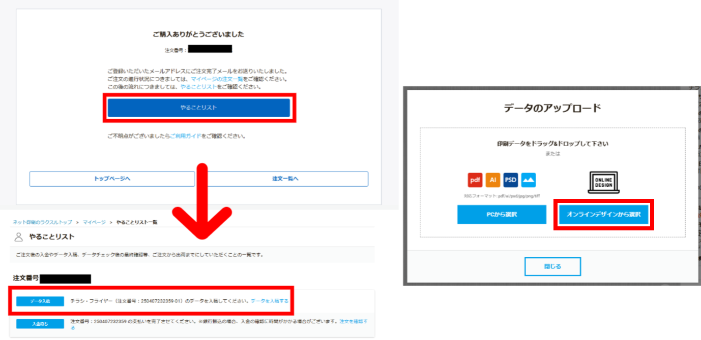 商品の注文が完了した後に、データ入稿にお進み下さい <後から入稿(注文完了後の入稿)の場合>