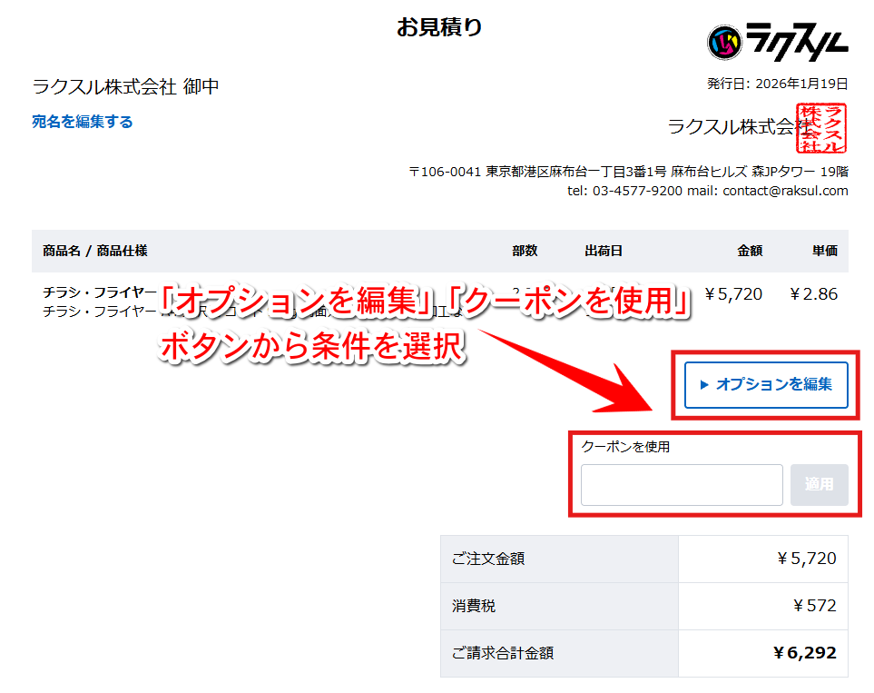 以下のオプションやクーポンをご利用の場合は、必ず「オプションを編集」「クーポンを使用」ボタンから条件を選択してください。