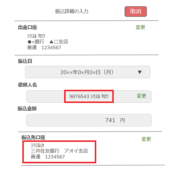 ・受取人名に誤りがある ×ラスクル(カ ⇒ 〇ラクスル(カ