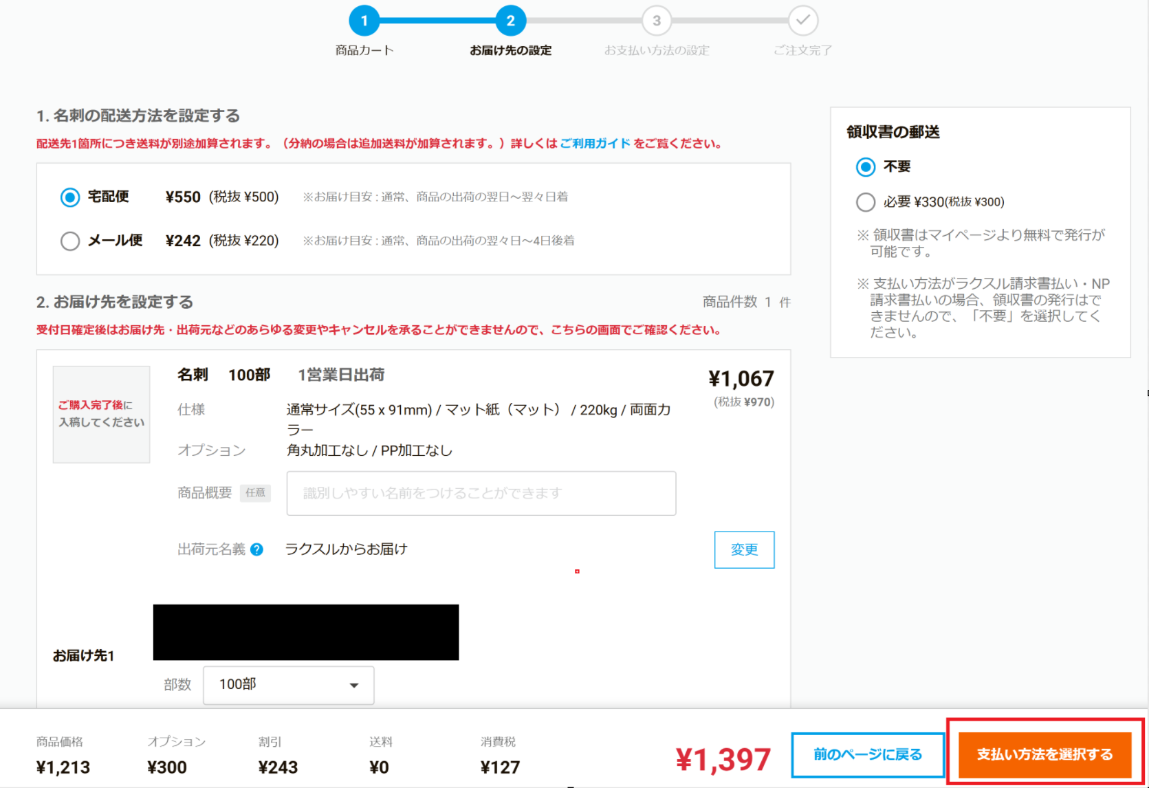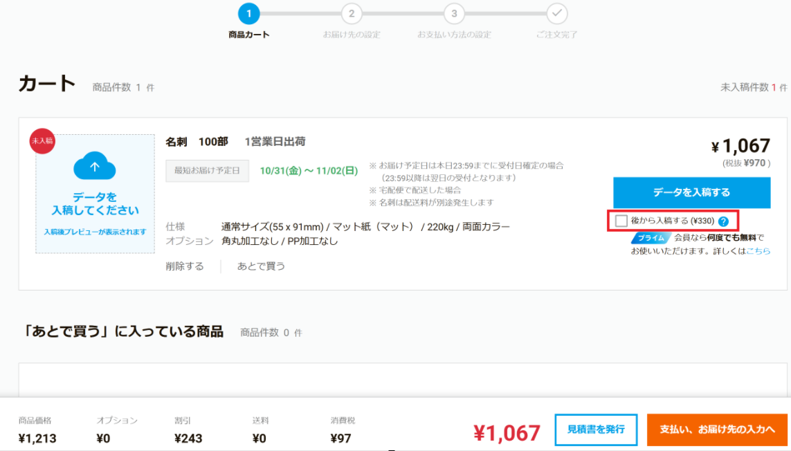 「後から入稿」を選択したら、「支払いお届け先の入力へ」に進みます。