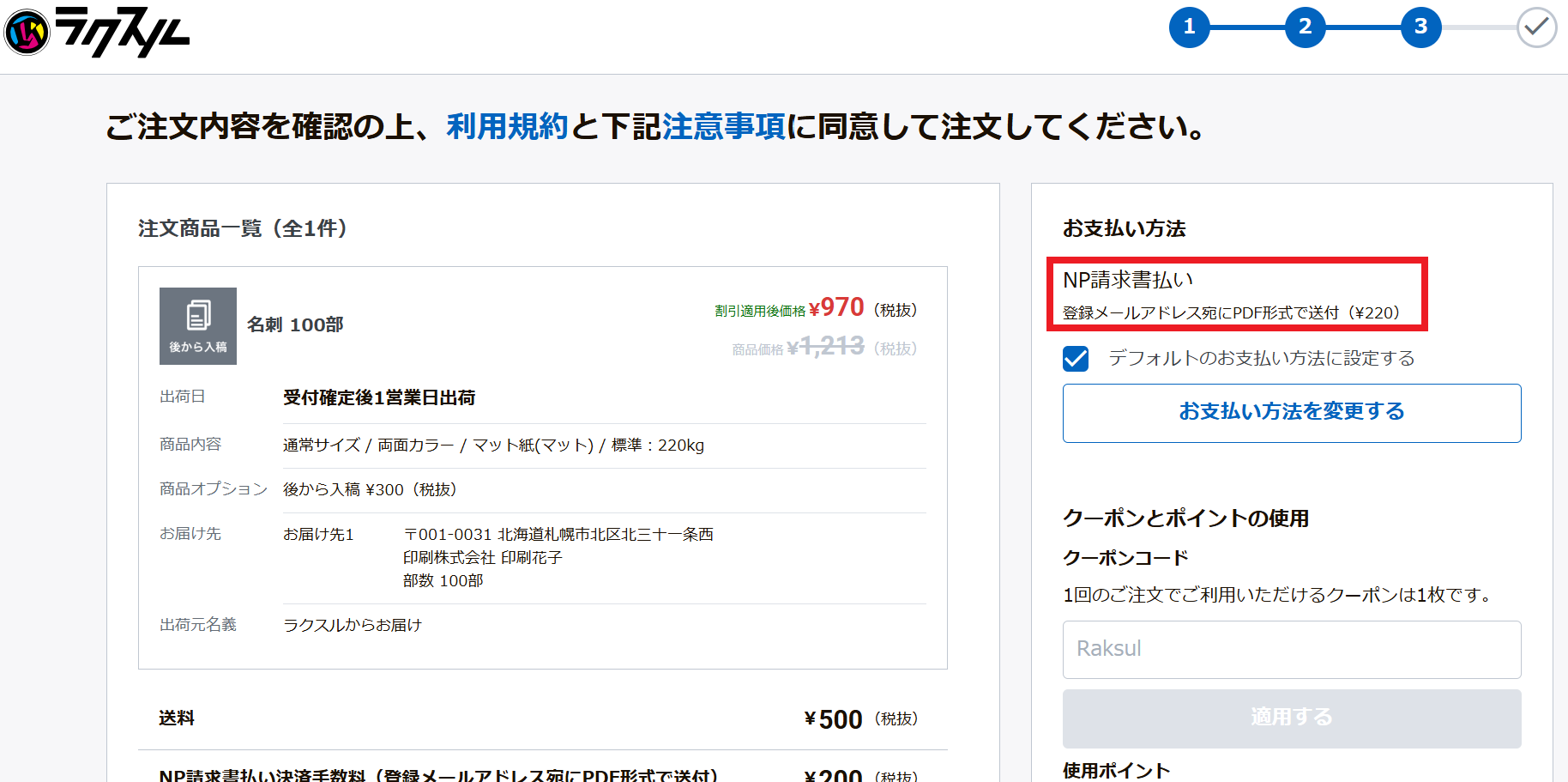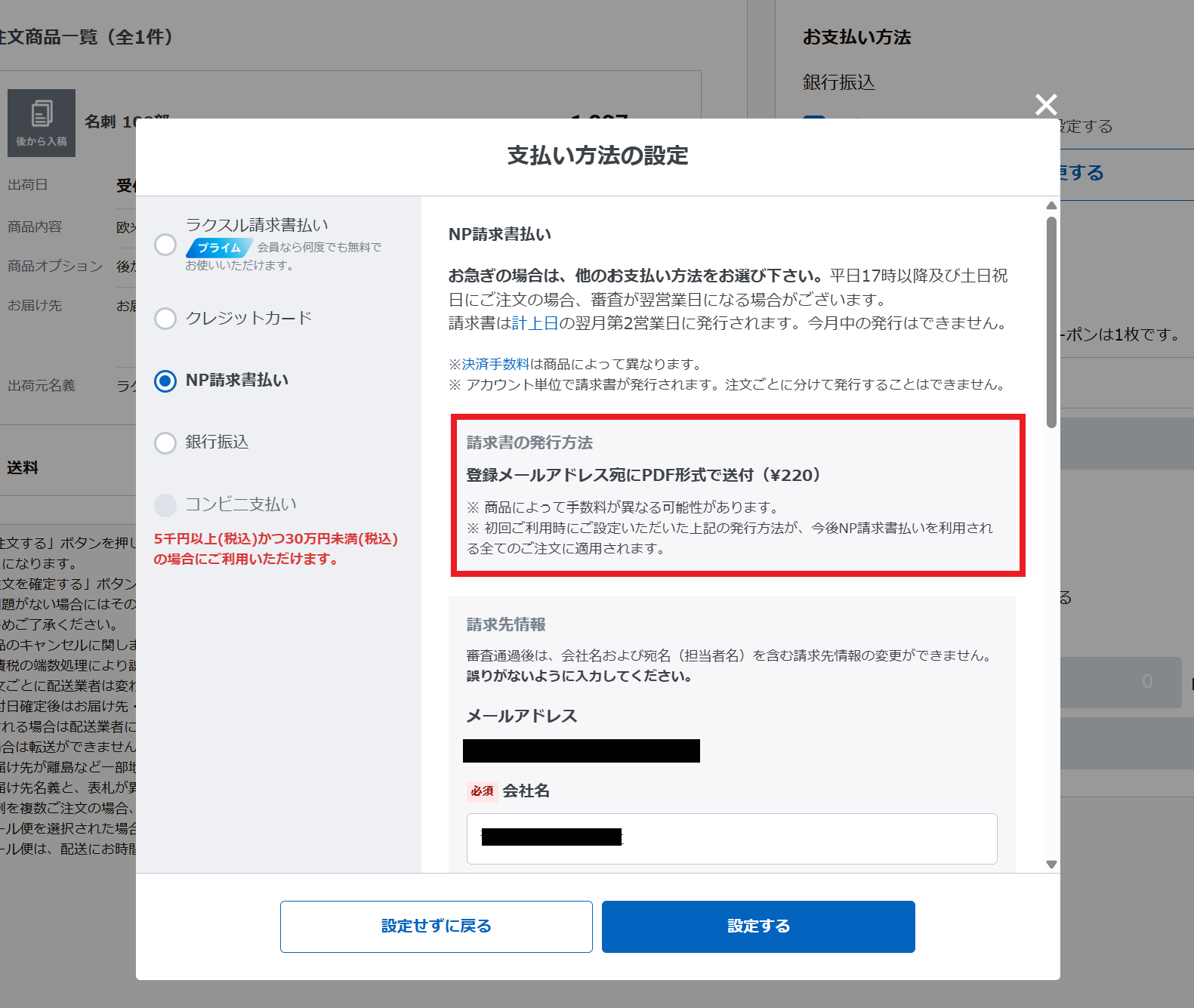 発行方法は初めてNP請求書払いを利用される際に、お客様によっていずれかをお選びいただいております。変更しない限りは原則、初回の選択が2回目以降の注文でも引き継がれます。