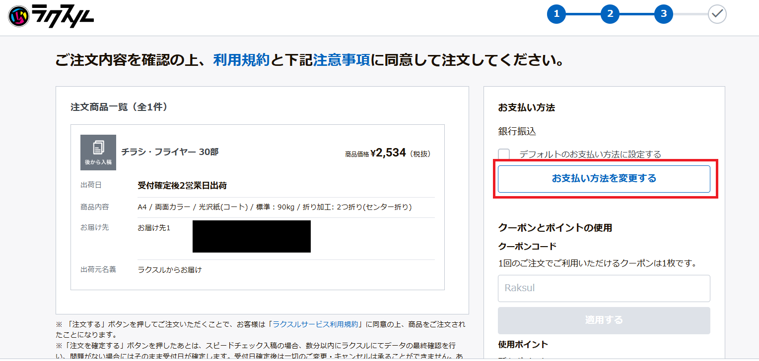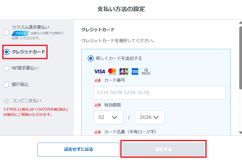 注文を進めていく中の「お支払い方法の設定」画面にて、新しいカード情報をご入力ください。