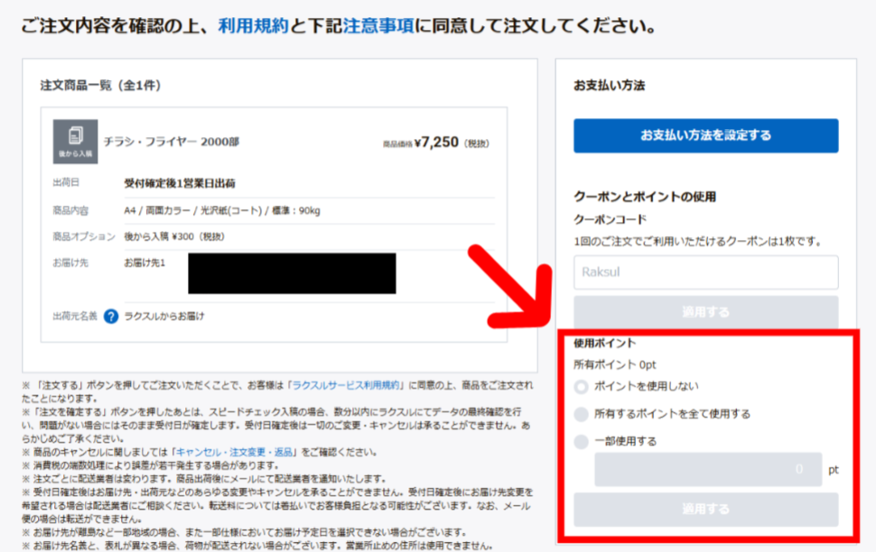 ご注文時のお支払い方法選択画面で、使用するポイント数を入力してください。