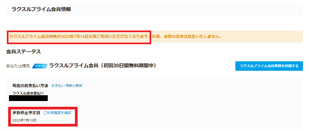 停止予定日については、ラクスルプライム会員情報からご確認いただけます。