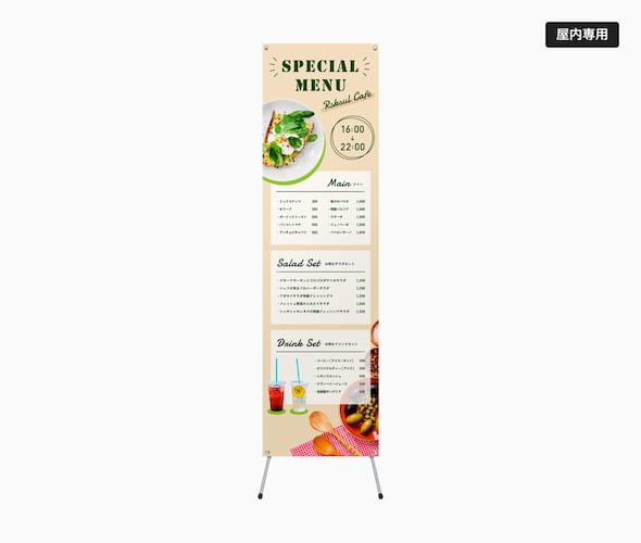 最も安価にご利用いただけ、スタンド部分が目立たないので見栄えが良い商品です。 一方で軽量のため、衝撃に弱く、屋外での利用に不向きです。生地の取り換えには対応していません。