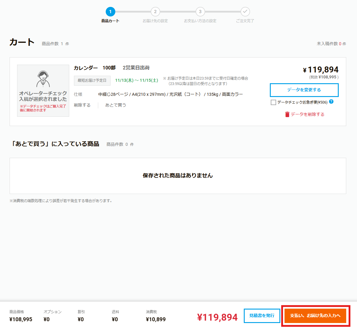 商品の印刷は、「データチェックの完了」と「お支払いの確認(ご入金確認)」の2つが揃った時点で「受付日確定」となり、その後、印刷工程へと進みます。