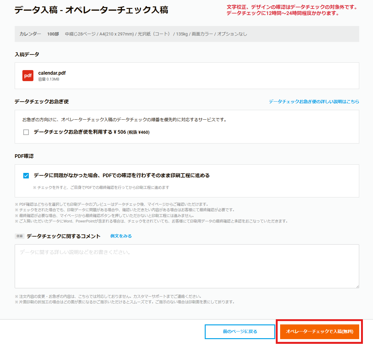 「データチェックお急ぎ便」、「PDF確認」、「データチェックに関するコメント」の項目をご確認いただき問題なければ「オペレーターチェックで入稿(無料)」をクリックする。