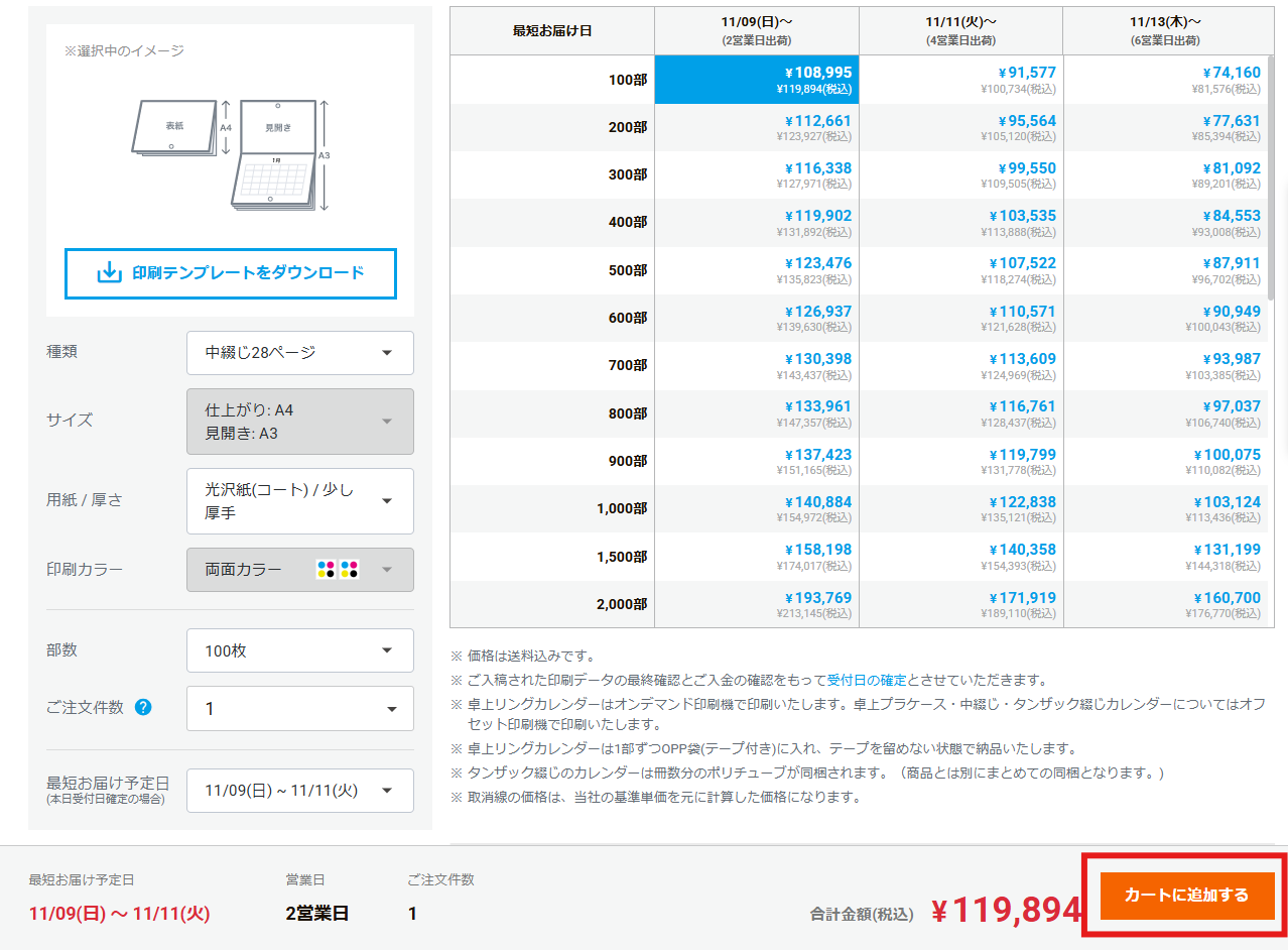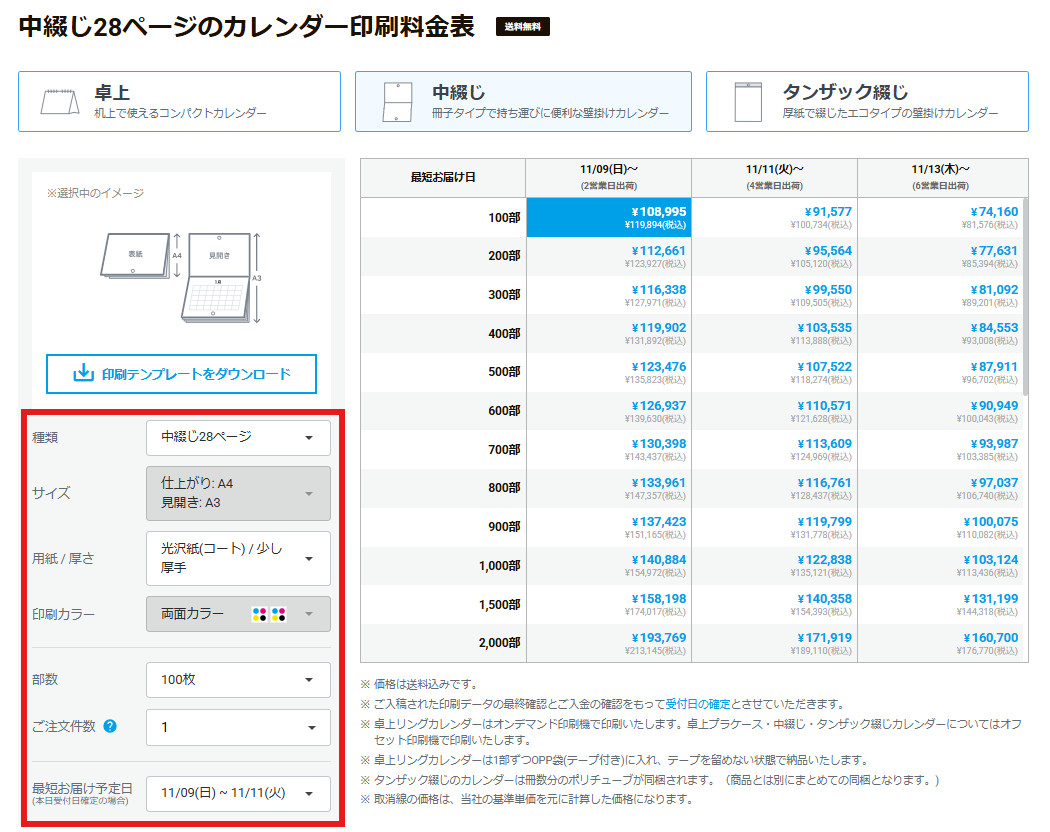 ご希望の商品ページ(卓上または壁掛け)で、用紙、部数、出荷日などの仕様を選択します。