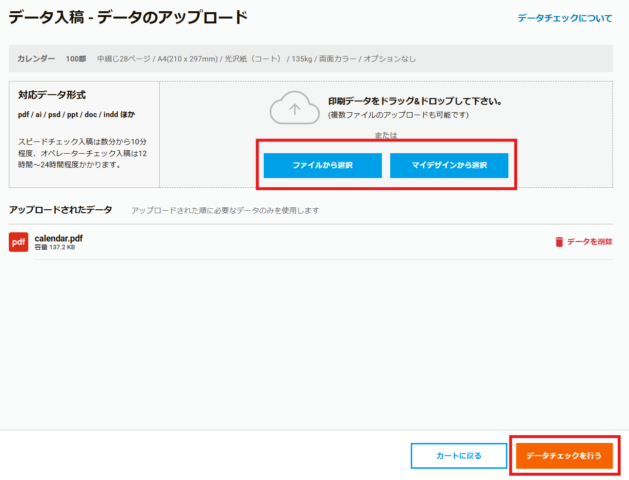 「データ入稿」の画面で、データの作成方法にあわせてボタンを選択し、データをアップロードしてください。