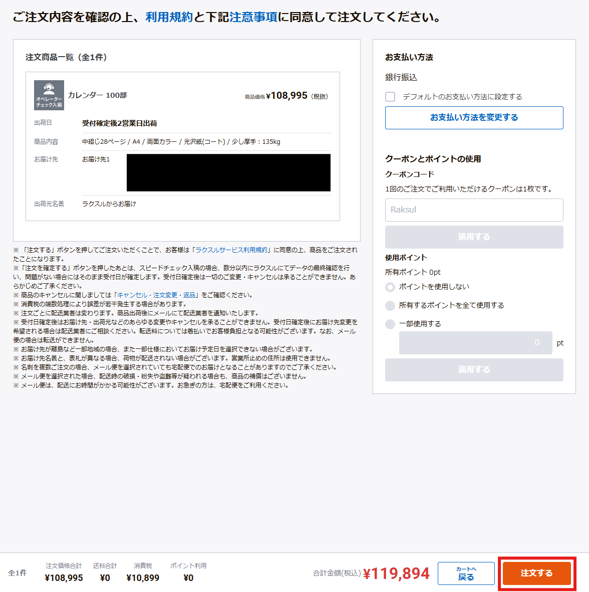すべての情報の入力が完了し、「注文を確定する」ボタンを押すとご注文完了となります。