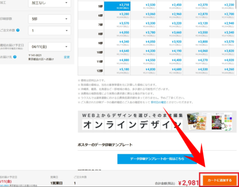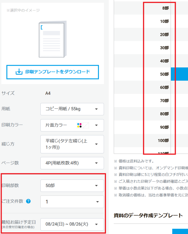 選択した部数・出荷日は青く表示されます。「○営業日後」は「受付確定日から出荷まで」の日数です。
