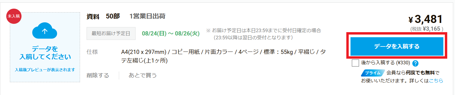 データをアップロードせず、「後から入稿する」を選択した場合には、続けてデータのご入稿をお願いします。
