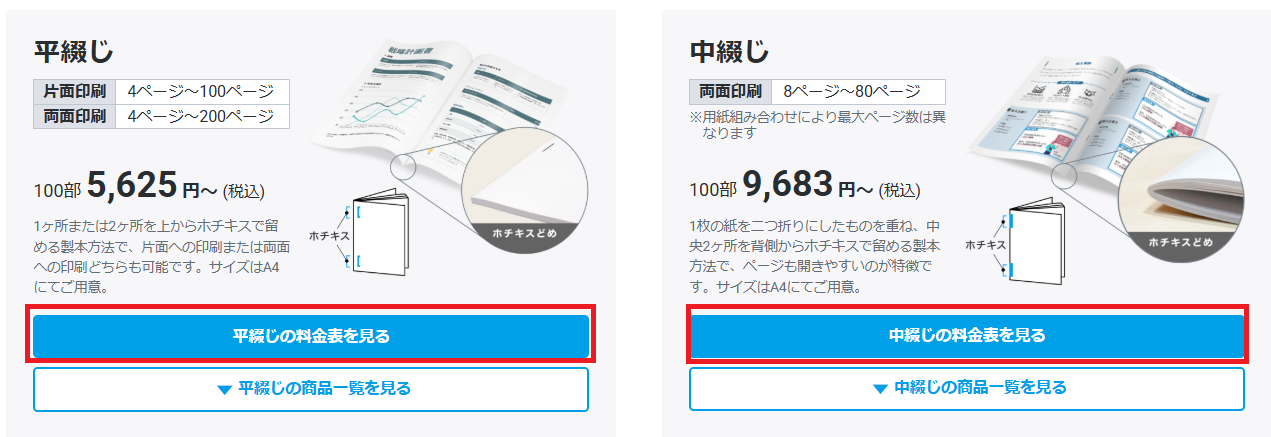 お安くお買い求めいただく場合は「平綴じ」、ページの開きやすさにもこだわる場合は「中綴じ」がおすすめです。