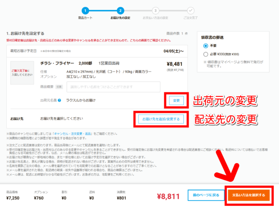 - データの入稿(または「後から入稿する」の選択)が完了した後「支払い、お届け先の入力へ進む」を選択してください。