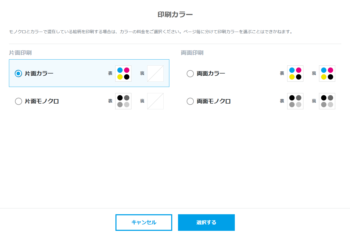 モノクロとカラーで混在している絵柄を印刷する場合は、カラーをご選択ください。ページ毎に分けて印刷カラーを選ぶことはできかねますのでご注意ください。