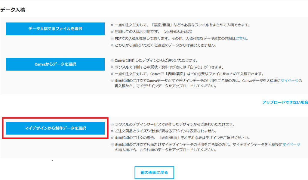 「マイデザインから制作データを選択」をクリックしてください。 - ※マイデザインデータはデザイン面のみテンプレートをご用意しております。