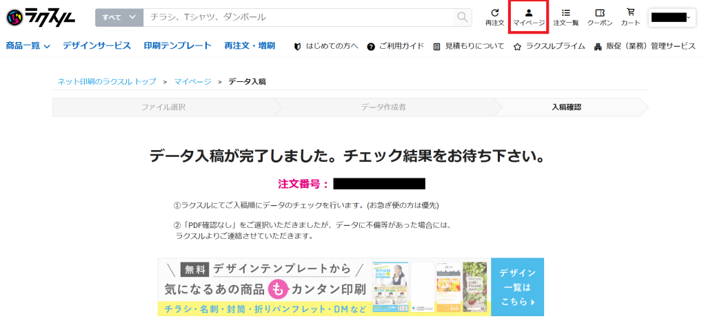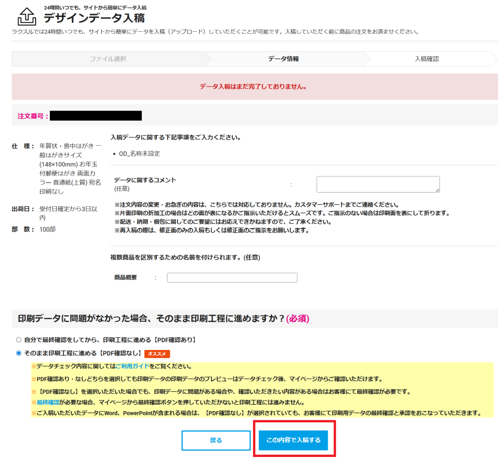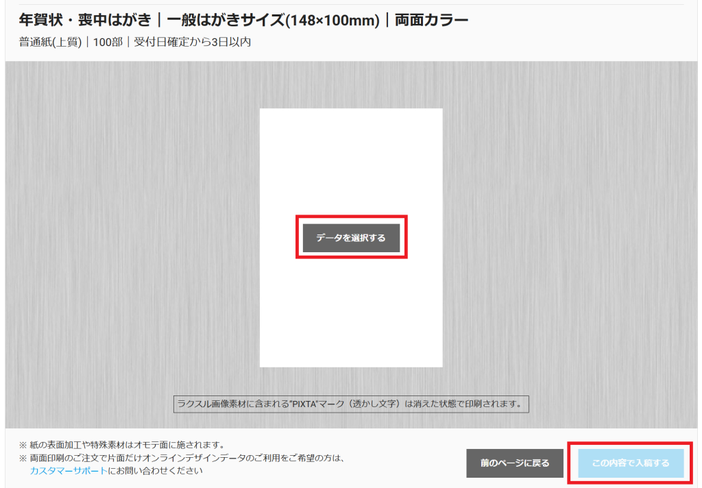 - こちらで両面データ(デザイン面・宛名面)の入稿が完了します。