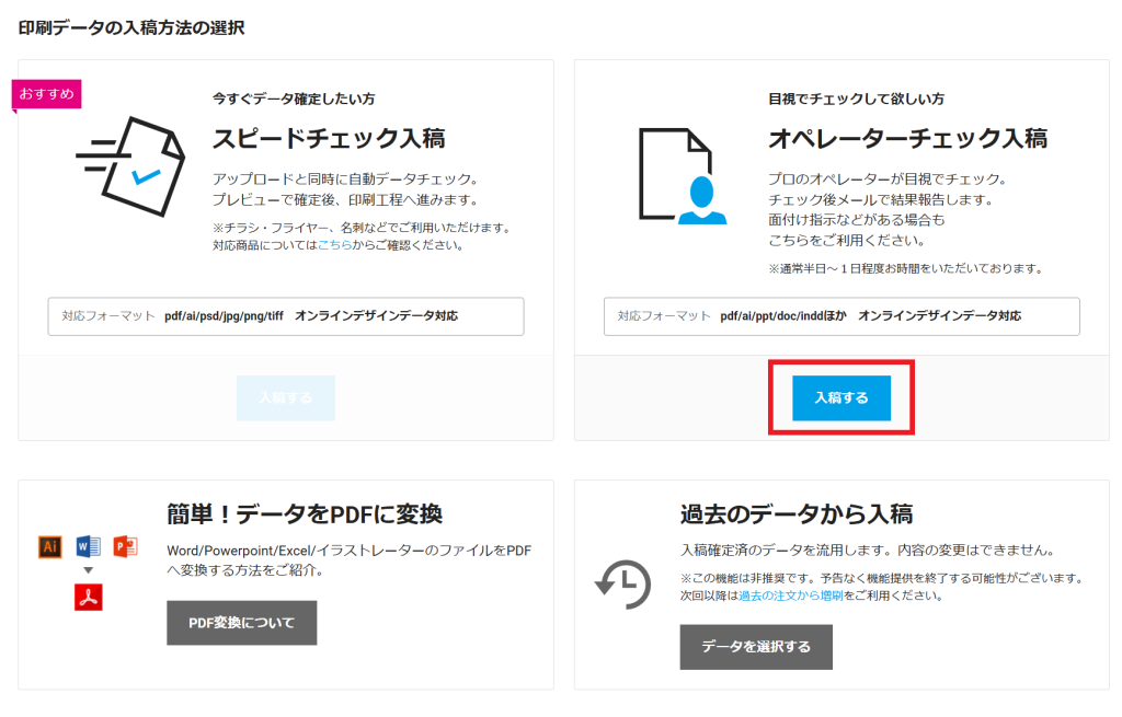 オペレータチェック入稿をクリックしてください。 - ※年賀状・喪中はがきの両面印刷をご注文の場合、スピードチェック入稿はご利用いただけません。