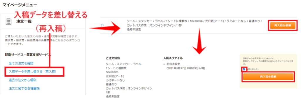 - マイページメニューの「入稿データを差し替える(再入稿)」をクリックします。