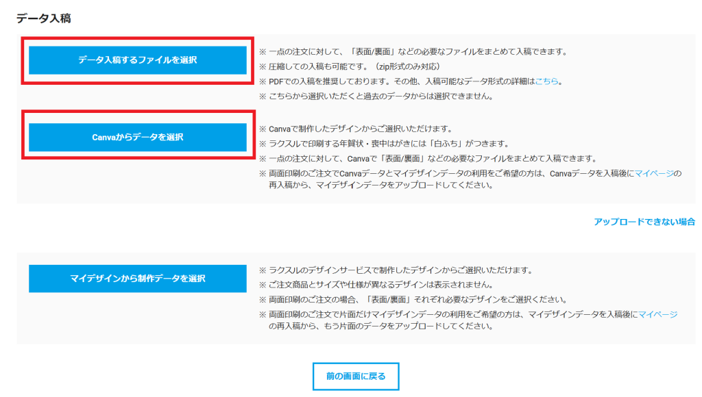 - 「データ入稿するファイルを選択」もしくは「Canvaから選択」のいずれかをクリックし