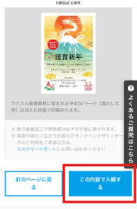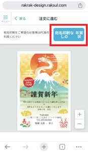 全ての編集が終わったら右上の「宛名印刷なしの年賀状」をタップし、注文ページへ進みます。