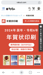 トップページの左メニューから紙印刷>年賀状・喪中はがき印刷 をタップしてください。