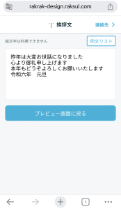 文面に迷ったら「例文リスト」をタップすると年賀状の挨拶例文集が表示されますので、お好きなものをお選びください。