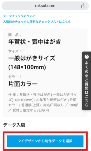 オペレーターチェック入稿のページに移動するので下にスクロールし、「マイデザインから制作データを選択」をタップします。