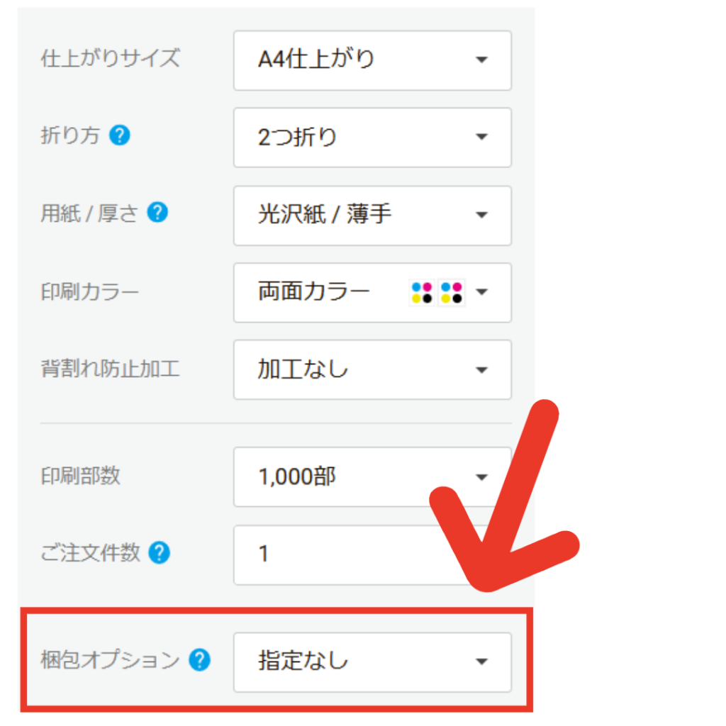1.折りパンフレット印刷の料金表で「梱包オプション」を選択