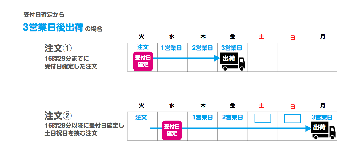 16時29分までに受付日が確定しないご注文は、翌営業日以降に受付日が確定するため、出荷日が後ろ倒しになります。