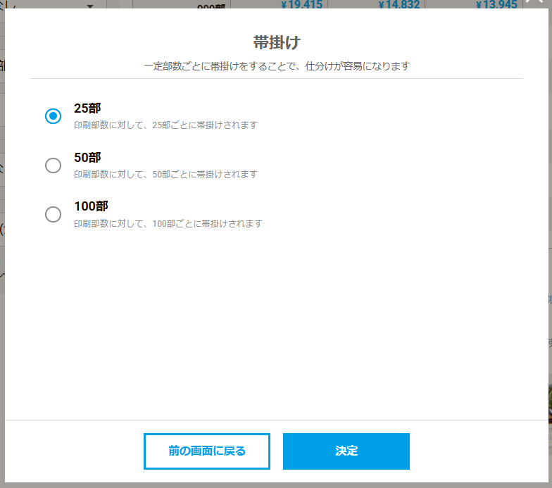- 一定部数ごとにクラフト紙などでまとめて帯掛けします。