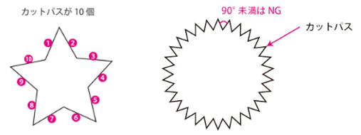 ・デザインに合わせたカットパスの作成をご希望の場合、原則カットパスのパス数は40パス以内、角度は90°以上になりますので、デザインによってはご希望に添えない場合がございます。