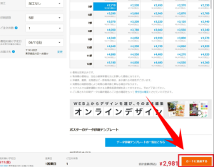 - データの入稿(または「後から入稿する」の選択)が完了した後「支払い、お届け先の入力へ進む」を選択してください。