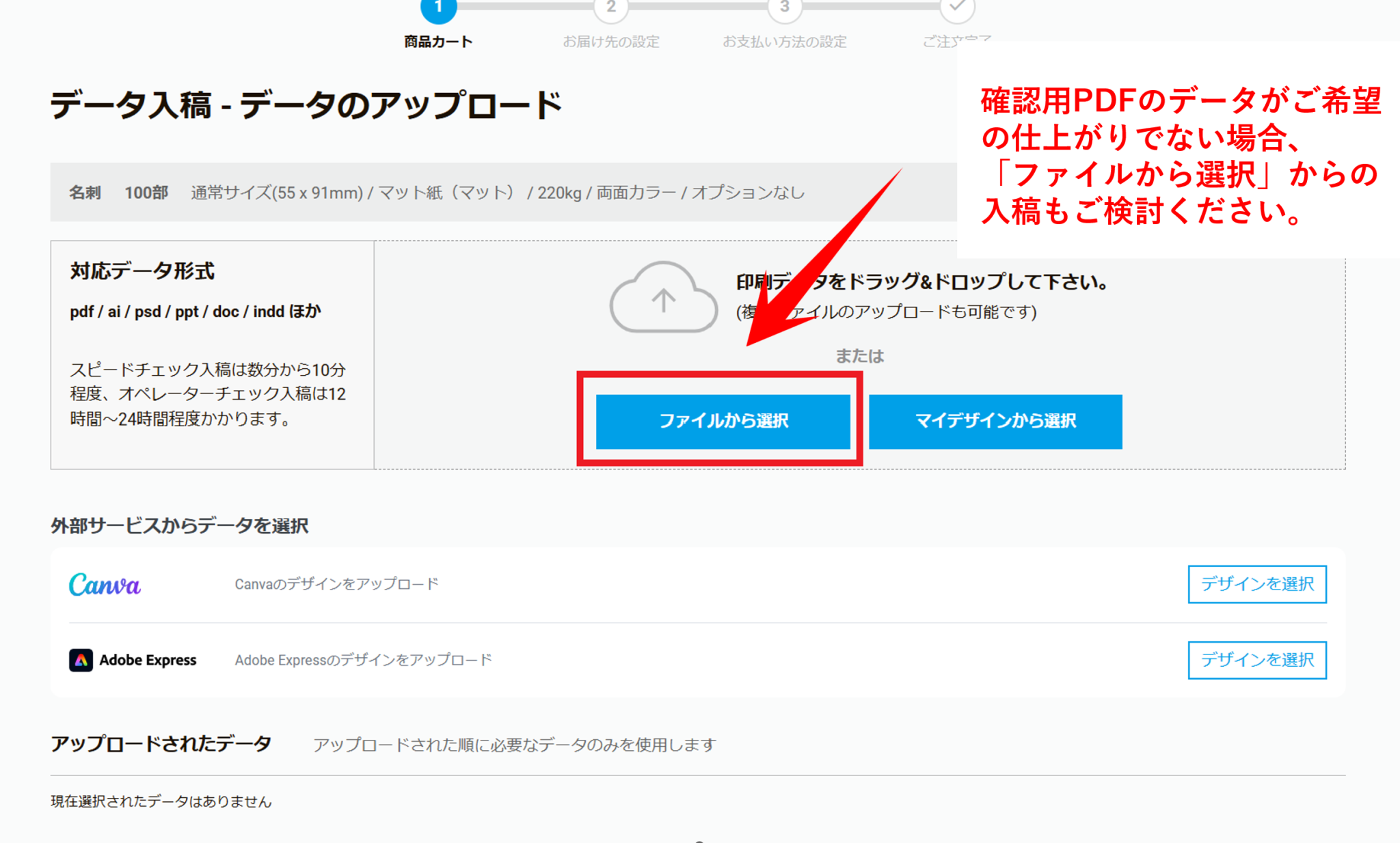 2.入稿画面に戻り、「ファイルから選択」で先ほどのPDFをアップロードし直してください。