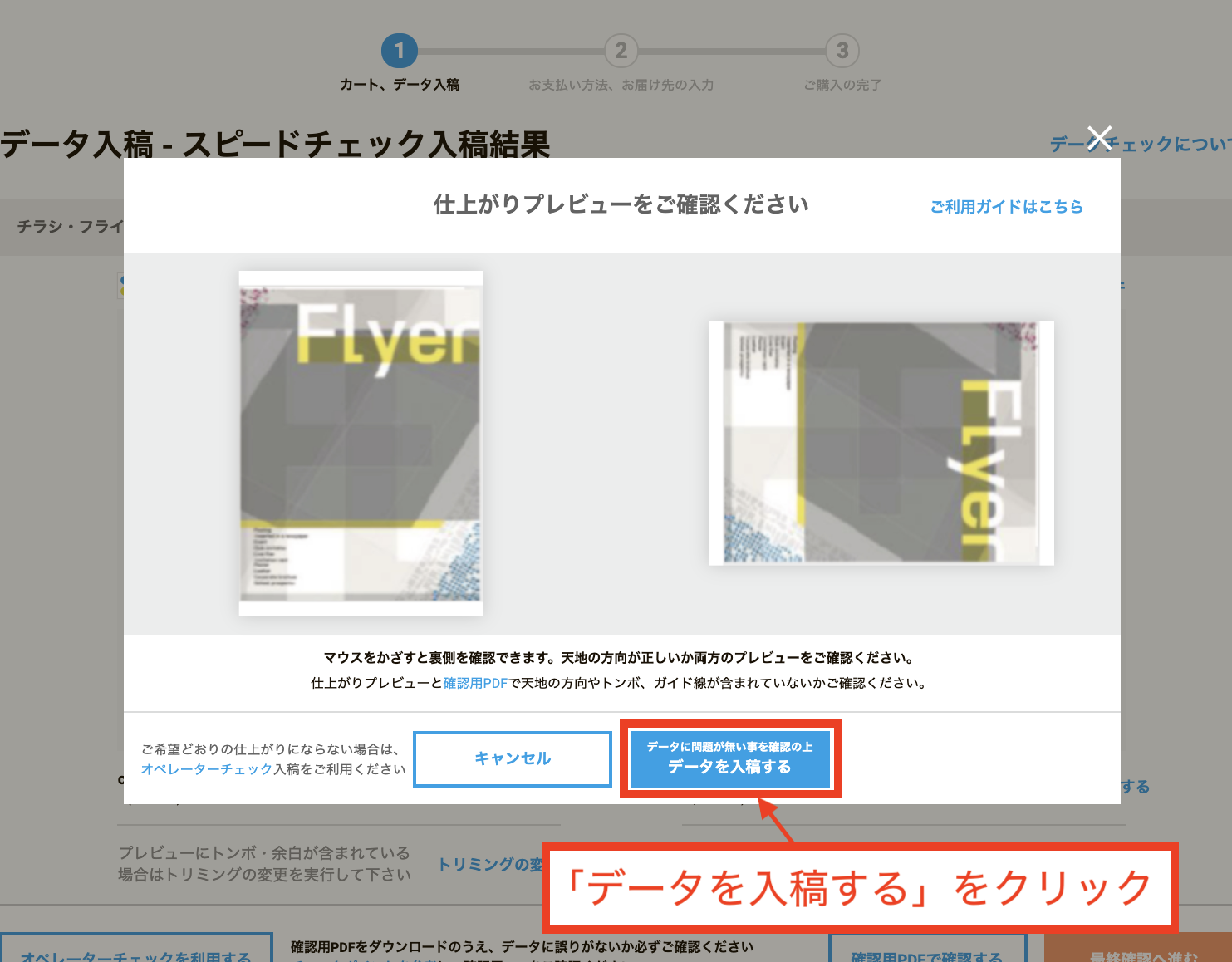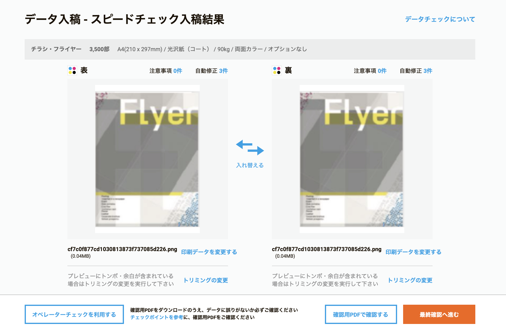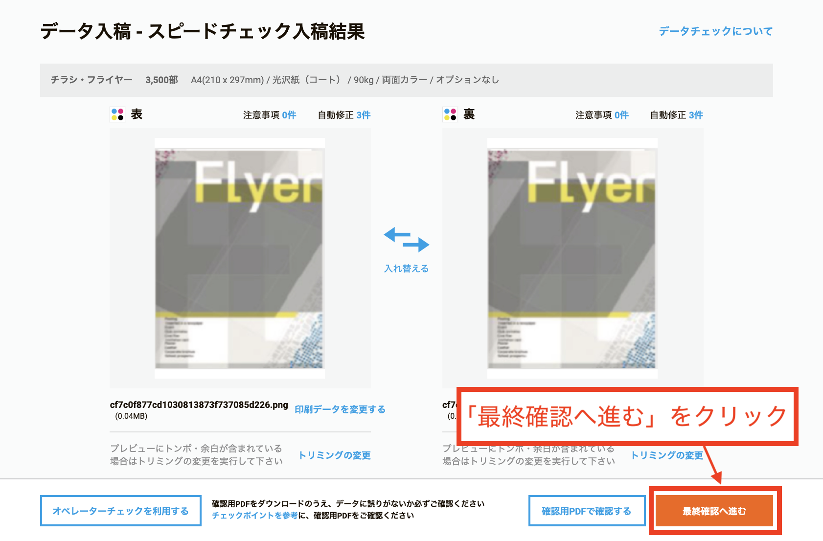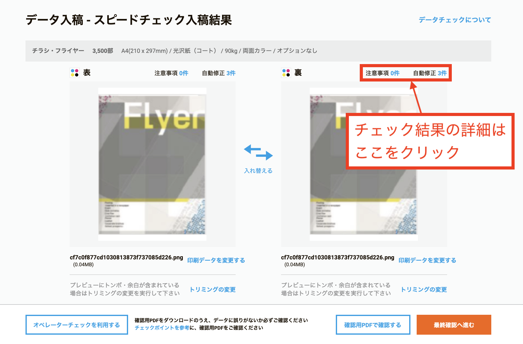 - 「注意事項」「自動修正」を確認したら、必ず確認用PDFをダウンロードして、データに問題ないかご確認ください。※確認用PDFの見方については、下記ご参照ください。